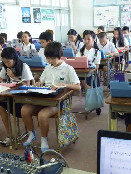 4・5・6年生は、音楽室で音楽の学習をします。こんな暑い日は「冷房」をきかせ、気持ちよく学習。リコーダーに鍵盤ハーモニカ、歌もしっかり声を出して。