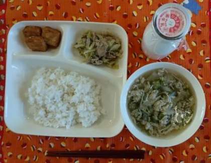 豚肉と野菜のいためもの、かきたま汁、あつあげのみそだれかけ、ご飯、牛乳
