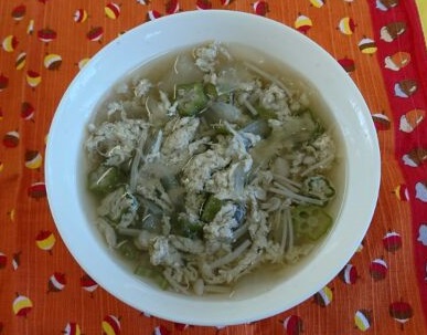 だしこんぶとけずりぶしでだしをとっています。旬のオクラ、たまねぎ、などが入った汁ものです。
