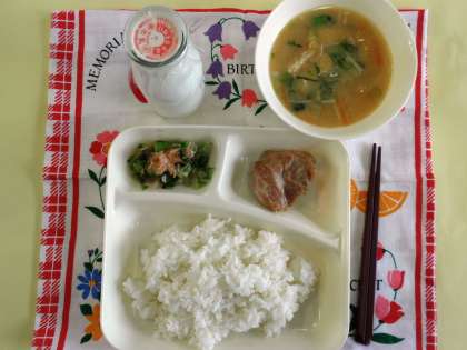 鶏肉のゆず塩焼き、みそ汁、菜の花のおひたし、ご飯、牛乳