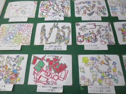 いろいろな形や線をつなげたり重ねたりして、模様をデザインしています。