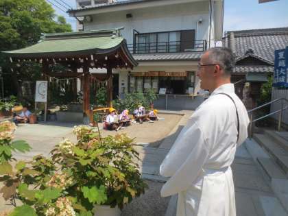 巽神社の方々のご協力を得て、境内で写生会をしています。秋の作品展に出品される図画かも?歴史ある神社の建物をしっかりと見て描いていました。