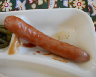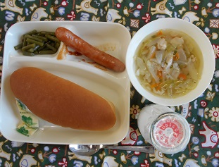ウインナーのケチャップソース、スープ、三度豆のサラダ、コッペパン、マーガリン、牛乳