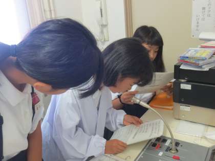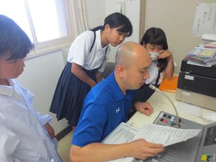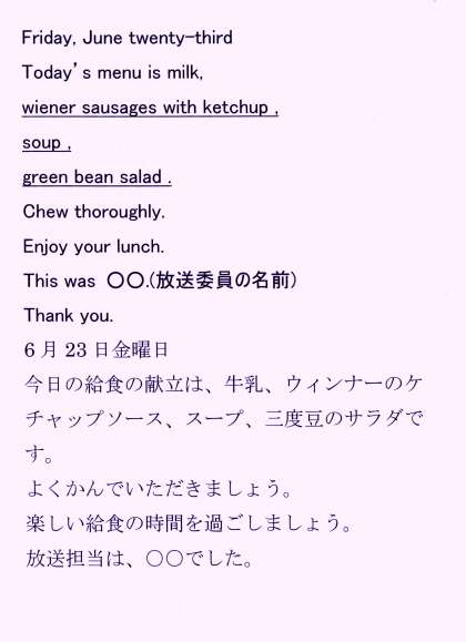 毎週金曜日、給食の時間に英語で献立を紹介します。まず放送委員会の児童が英語で・・・そのあと、英語のカーン先生が同じ献立を英語で紹介します。
