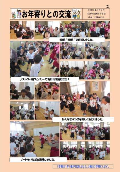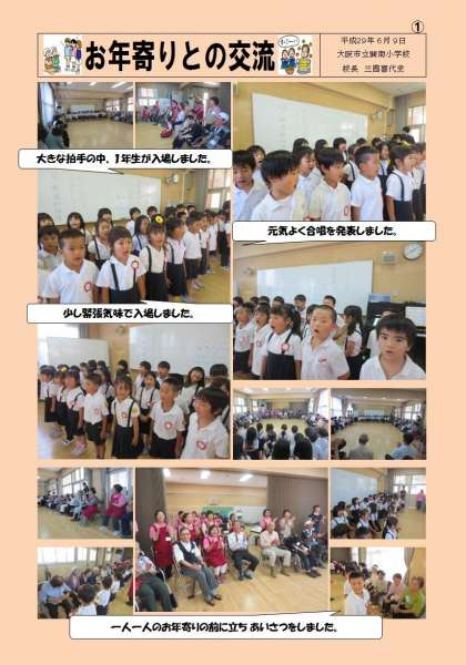 6/9(金)地域のお年寄りの方々との交流をしました。最初に丁寧にあいさつをして、元気よく「校歌」などの合唱を発表しました。お年寄りの方々は、元気で可愛い子どもたちの演技に、笑顔で大きな拍手を送っていました。ゲームをして負けると肩たたき・・・勝っても負けても笑顔でした。最後に一人一人の子どもたちにノートをいただきました。ありがとうございました。