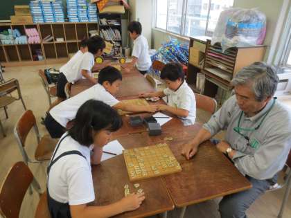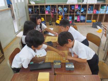 まだ駒の動かし方を覚えていない子どもたちは、「はさみ将棋」でも対戦しています。将棋に慣れていない1年生は、できるだけお家の方でも将棋をして駒の動かし方を早く覚えるようにして下さい。