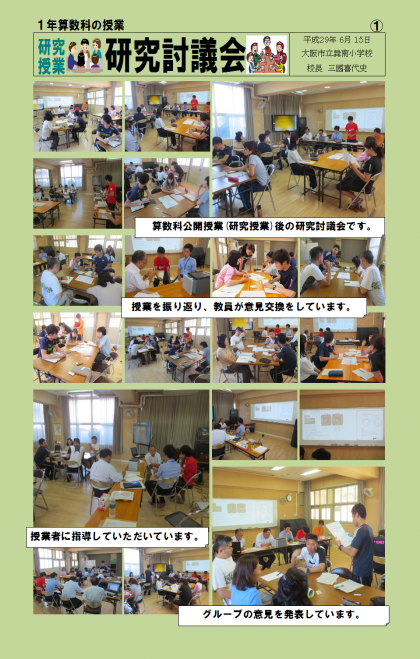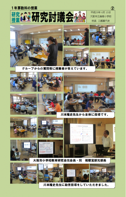 6/15(木)1年1組(算数科)の公開授業(研究授業)後、教員による研究討議会を実施し、成果・課題・質問等の意見を交流し授業を検証しています。また、外部講師の方に指導をいただき、各教員が授業力を高める機会にしています。指導助言には、川本隆史先生(大阪市小学校教育研究会元会長・視聴覚部元部長)にご来校いただきました。ありがとうございました。