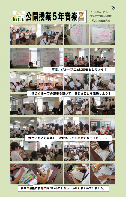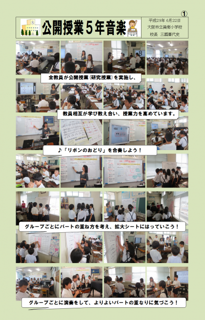 校内において6/22(木)公開授業(研究授業)を、5年2組(音楽科)で実施しました。授業を参観することで教員相互が学び教え合い、授業力を高める機会にしています。