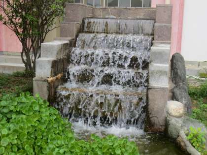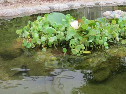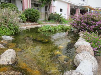 学校の小川や滝には多くの生き物たちがいます。そのためには水生植物が必要です。地域の緑化委員会の協力もあり、ウチワゼニグサ・フトイ・ウォータークローバー・スイレンなどが育っています。