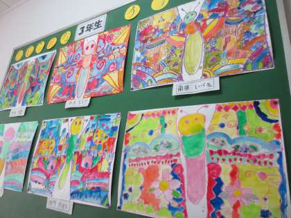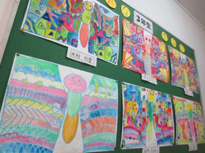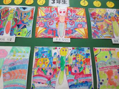 「おしゃれなチョウ」一人一人が丁寧に描いています。とても明るくカラフルなチョウです。