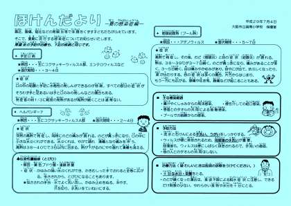 最近、腹痛、嘔吐などの胃腸炎等で体調をくずす子どもたちが増えています。「ほけんだより」では、夏期に流行する感染症についてお知らせしています。