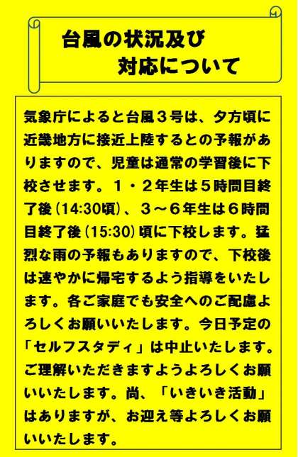 気象庁によると台風3号は、夕方頃に近畿地方に接近上陸するとの予報がありますので、児童は通常の学習後に下校させます。1・2年生は5時間目終了後(14:30頃)、3〜6年生は6時間目終了後(15:30)頃に下校します。猛烈な雨の予報もありますので、下校後は速やかに帰宅するよう指導をいたします。各ご家庭でも安全へのご配慮よろしくお願いいたします。今日予定の「セルフスタディ」は中止いたします。ご理解いただきますようよろしくお願いいたします。尚、「いきいき活動」はありますが、お迎え等よろしくお願いいたします。