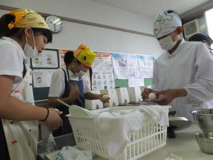 7/5(水)食パンを使っての「たまごサンド」です。手際よくどのグループも上手に調理を進めていました。