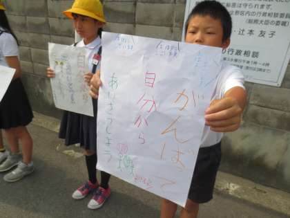 児童会代表の子どもたちは、それぞれが考えたポスターをもち、朝のあいさつを呼びかけています。「がんばって自分からあいさつしよう」「しっかりとあいさつしよう」