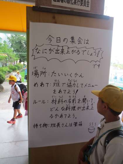 今日の集会は「なにが出来上がるでしょう」です。材料の名前を聞いて、どんな料理が出来上がるかあてます。