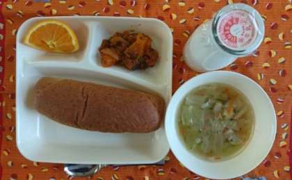 かぼちゃのミートグラタン、スープ、オレンジ、ライ麦パン、牛乳