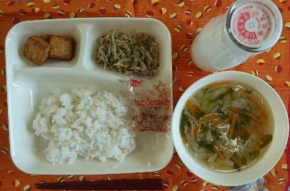 ゴーヤチャンプルー、五目汁、あつあげのしょうがじょうゆかけ、ご飯、牛乳