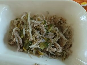 にがうり(ゴーヤ)と豚肉もやしをいため、塩、こい口しょうゆで味つけします。かつおぶしをかけて食べます。