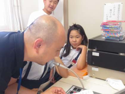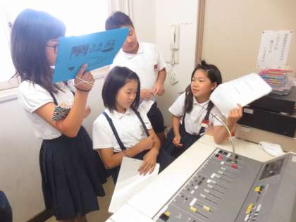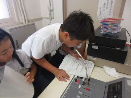 毎週金曜日、給食の時間に英語で献立を紹介します。まず放送委員会の児童が英語で・・・そのあと、英語のカーン先生が同じ献立を英語で紹介します。