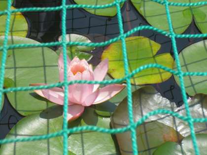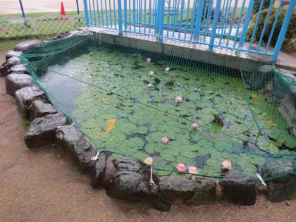 池にはコイ・キンギョ・ドジョウ・ザリガニ・メダカ・ヤゴなど色々とすんでいます。これも子どもたちの楽しみです。池のネットは「アオサギ」からまもるためにしています。