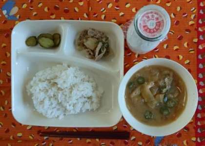 豚肉とピーマンのしょうが焼き、とうがんのみそ汁、きゅうりのピリ辛和え、ご飯、牛乳