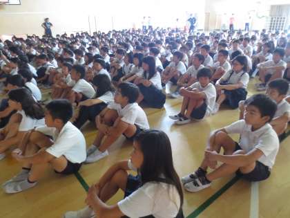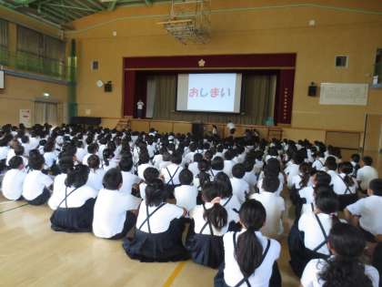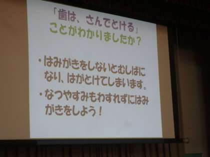 次に生活の中でどうすればむし歯予防ができるのかを、プレゼンでくわしく全校に呼びかけていました。
