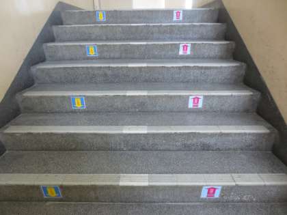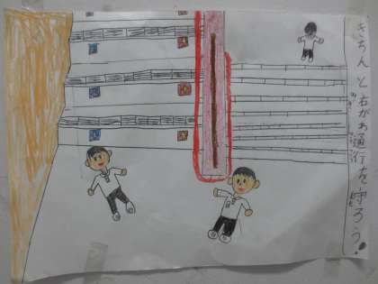 児童が「右側通行」を呼びかけるポスターを階段や廊下に掲示しています。安全第一です。みんなに守ってほしいです。