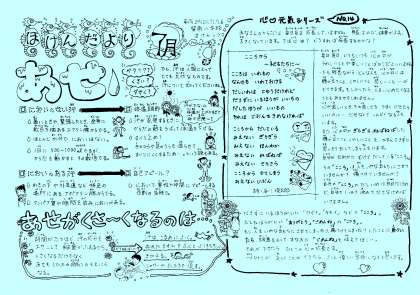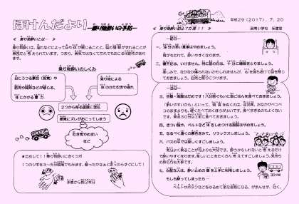 夏はたくさんの汗がでます。汗は人間にとってとても大切なものです。その汗についてのことを先週配布した「7月ほけんだより」に載せています。ご覧ください。また、林間学習に行く5年生には、乗り物酔いの予防についての「ほけんだより」も配布しています。