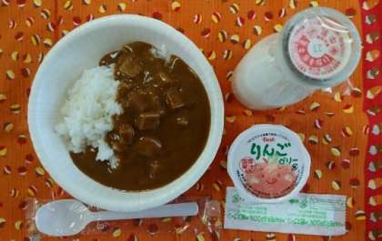 野菜カレー、りんごゼリー、牛乳