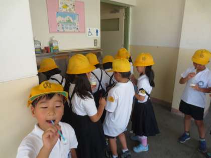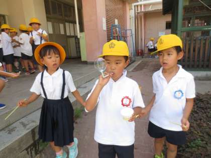 7/19(水)1年生全員でシャボン玉づくりをしていました。