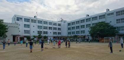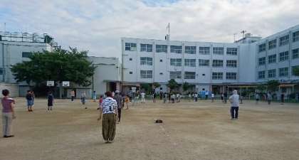 四条公園では1町会、ふれあい公園では5町会、グリーンマンション下では7町会、南巽公園では8町会、巽南小学校運動場では2・3・4・6・9町会がラジオ体操を実施しています。今日は、巽南小学校運動場での様子を紹介します。