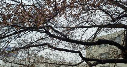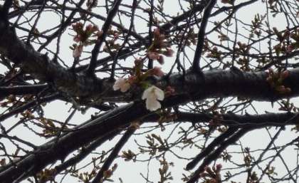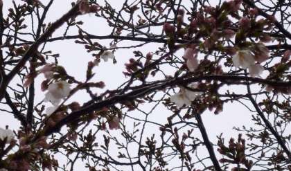 校庭の大きな桜の木。花びらも開花し始めました。春の訪れを感じさせてくれます。