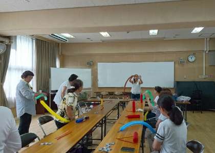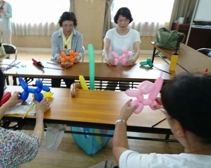 7月24日(月)11時から多目的室で、はぐくみネット「おとなミニ研修」を実施しました。今年は、細長いカラフルな風船を使った「バルーンアート指導法入門」の研修会を実施しました。はじめは、風船を膨らませるのも難しかったですが、講師の方の指導によって基本的なことがわかり、いろいろな形づくりにチャレンジしました。