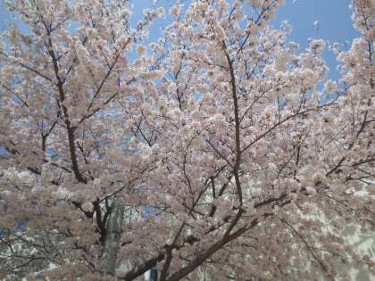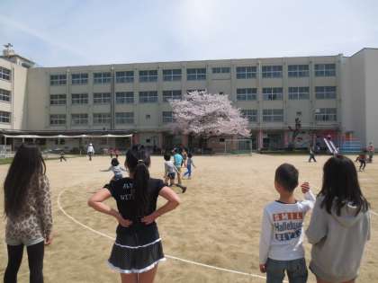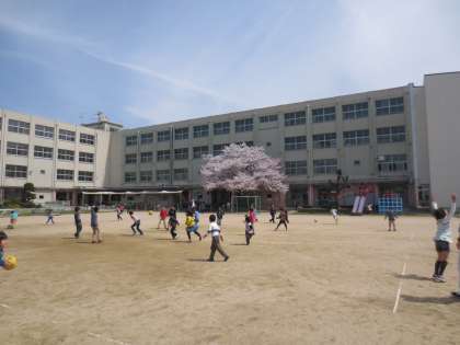 暖かい日差しの中、満開の桜の下、いきいき活動の子どもたちが元気に遊んでいます。