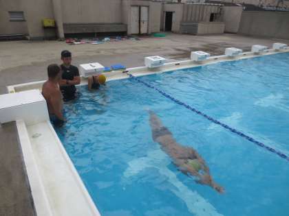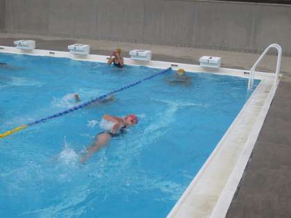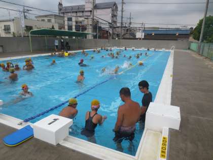 高学年(4・5・6年)のプール開放です。水泳記録会に出場する児童はコースロープで区切り練習をしています。他の児童は、水泳練習後の自由練習をしています。気温35度の中、とても気持ち良さそうに友だちと練習をしています。先生と遊んでいる児童も・・・たくさんいます。
