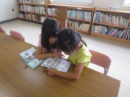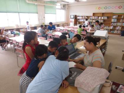 夏休み中も学校図書館を開放しています。今日は吉田先生とボランティアの春山さんに、学校図書館を開放していただいています。