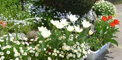 暖かな日差しの春休み。校庭の花が満開です。
