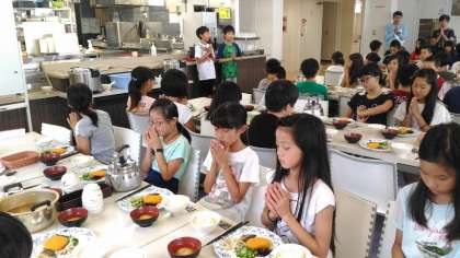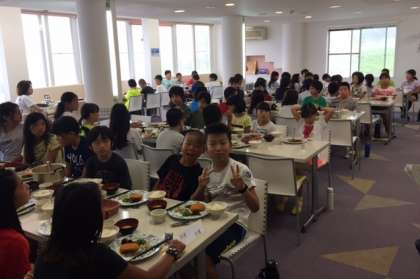 林間学習では初めての朝食です。今日の朝食は和食です。朝の会でラジオ体操をして、心身ともにスッキリしました。ご飯もしっかり食べることができていました。