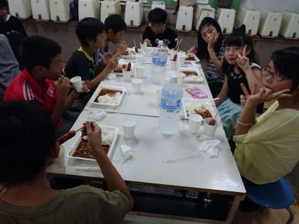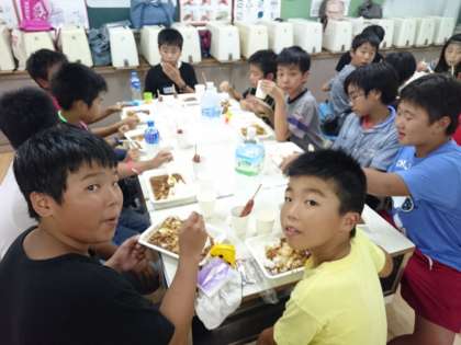 テントで泊まる6年生は、家庭科室で夕食を食べました。保護者の方が作っていただいたカレーライスはとてもおいしかったです。夕食後は、お風呂屋さんに行ってスッキリした後は、テントで寝ました。学校の運動場で泊まるのはやっぱりわくわくして、クーラーのないテントでは、なかなか寝ることができませんでした。