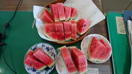 学習園で育てていた、スイカも収穫の時期になりました。昨日から、冷やしていたスイカを食べてみました。みずみずしくて、甘みもあり、とてもおいしかったです。まだまだ学習園にはスイカがたくさんあります。楽しみです。