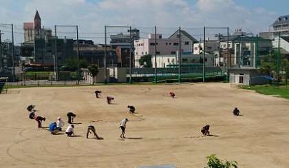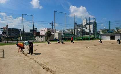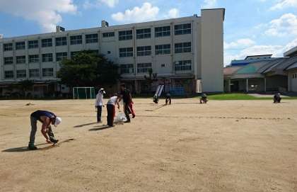 運動場のラインが切れていたり、土に埋まっていたりしていましたので、職員作業で運動場のラインを改修しました。はじめに、古いラインを取り除きました。暑さに負けないで、教職員が一丸となって頑張りました。