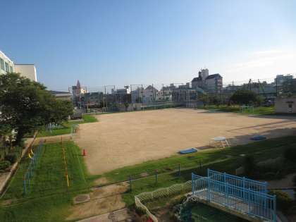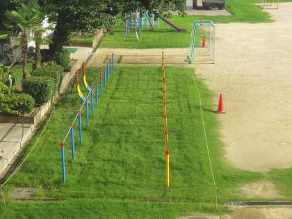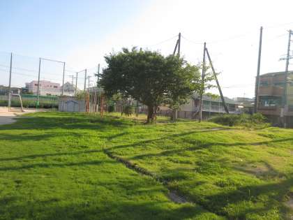 夏の日差しを受け、芝生の緑が広がっています。地域にご支援いただいている芝生は、子どもたちのケガの軽減と熱中症対策に活かされています。