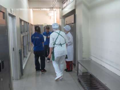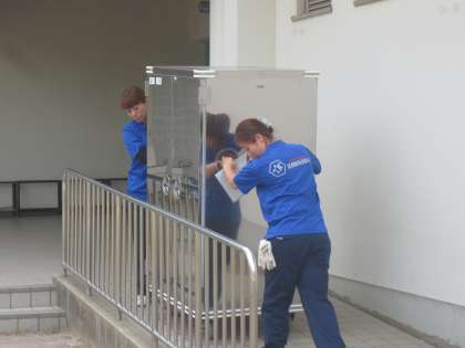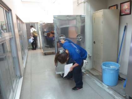 今日から新巽中学校との親子給食が開始されます。巽南小学校で調理した「おかず」食缶を、カギ付きコンテナに入れて、配送業者がトラックで運びます。