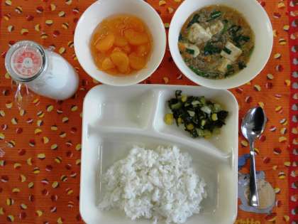 マーボーどうふ、チンゲンサイとコーンの中華あえ、みかん(缶)、ご飯、牛乳