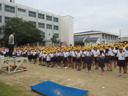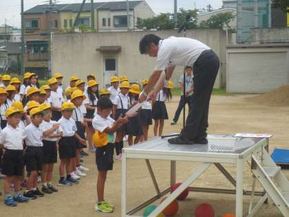 橋本先生の指導で全校朝会が開始され、9月最初の生活目標のお話がありました。校長先生より、児童絵画展からの賞状を渡しました。