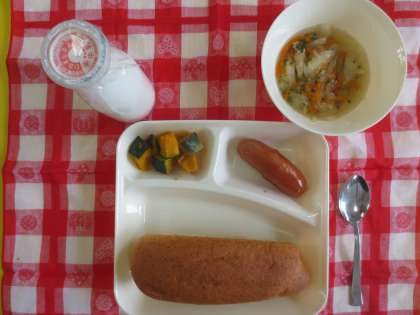 フランクフルトのケチャップソース、スープ、焼きかぼちゃ、ライ麦パン、牛乳