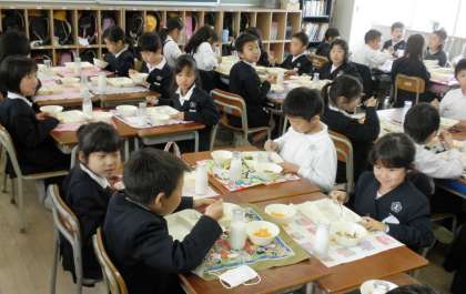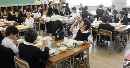 2年生に進級し、新しいクラスの友達と給食のじかんです。