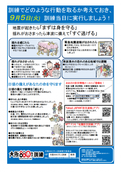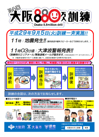 「大阪880万人訓練」は、大阪府民が、様々な情報源から地震・津波発生情報を認識し、地震・津波発生時に行動できるようにすることを目的としています。内容は、緊急速報メール送信や小学校屋外スピーカー等を使った緊急放送訓練をいたします。日時は9月5日(月)午前11時です。