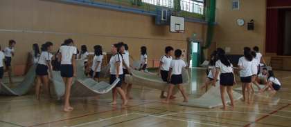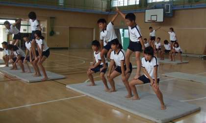 安全のためにマットを敷いて練習。協力しながら、グループで1つ1つの技を少しずつ完成させていました。後片付けも、自分たちであっという間に終わりです。