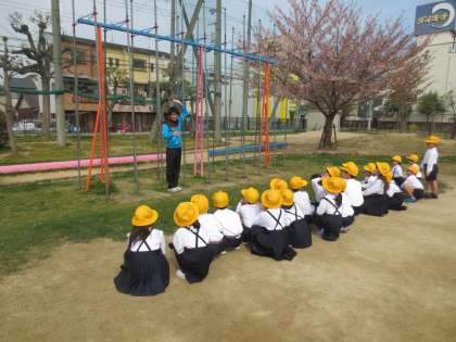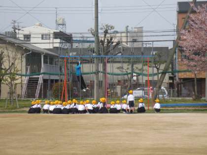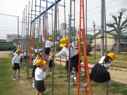 運動場にある遊具(登り棒)で遊ぶ練習です。しっかりとお話を聞き、楽しく練習しています。1年1組